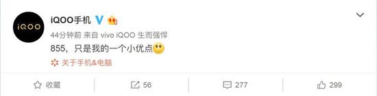 今天@iQOO手机官微发布消息称,“855,只是我的一个小优点”,暗示新机将采用骁龙855处理器,看来该品牌很可能是定位旗舰,根据此前的海报透露,有可能会是游戏手机,但目前还不能确定。