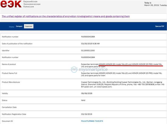 在欧亚经济委员会的产品库中出现了Honor 20(荣耀20)和Honor 20 Pro(荣耀20 Pro)的身影,前者型号为YAL-L21,后者型号为YAL-L41。