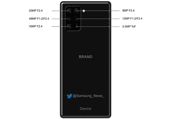 造型方面,六颗摄像头为呈矩形排布,第一列的三颗从上到下分别是2000万像素F2.4光圈、4800万像素(F1.2/2.4可变光圈)、1600万像素(F2.4光圈)、800万像素(F2.4光圈)、1200万像素(F1.2/2.4可变光圈)、50万像素ToF深感镜头。