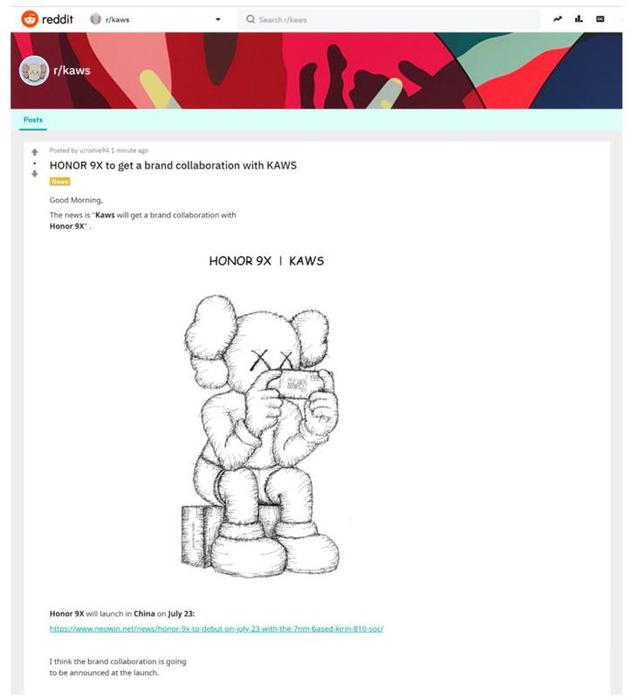 爆料信息显示,荣耀9X将于7月23日发布,届时,还会宣布荣耀9X和KAWS达成品牌合作的消息。