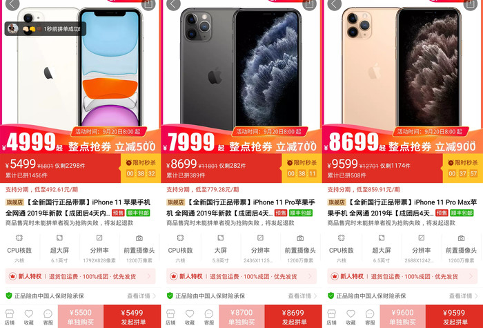 再9月20日刚刚开售,某电商平台迎来一波促销活动。iPhone 11抢卷优惠500元,仅需要4999元便可把新iPhone带回家。具体优惠信息为iPhone 11整点抢卷立减500元,最低4999元起售;iPhone 11 Pro整点抢卷立减700元,最低7999元起售;iPhone 11 Pro Max整点抢卷立减900元,最低8699元起售。刚开售就破发,可以说明,iPhone 11系列的“降价空间”非常大,不到两个月便是“双十一购物狂欢节”,到时候入手是不错的选择。