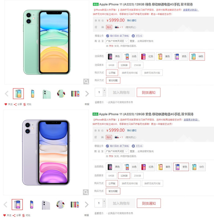 iPhone 11 64GB版本售价5499元;128GB版本售价5999元;256GB版本售价6799元。